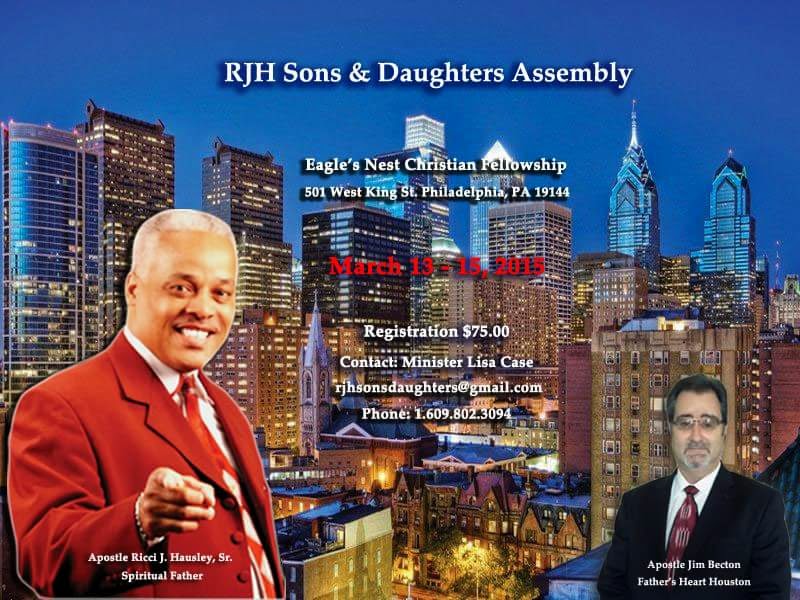 Looking forward to the apostolic/Prophetic gathering with Apostle Ricci J. Hausley, Sr. And the RJH SONS & Daughters Assembly at Eagles Nest Christian Fellowship in Philadelphia, Pa. March 13-15!